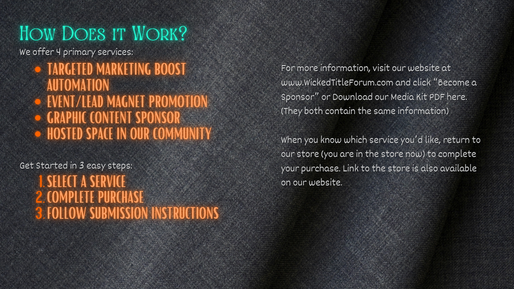 If you're interested in advertising and sponsorship opportunities with the Wicked Title Forum, you can find out more on our website, or download our PDF Media Kit for free here. (The information is the same on both)